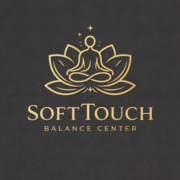 금색 연꽃 위에 명상 자세의 인체 실루엣이 있는 소프트터치 밸런스센터 현대식 로고